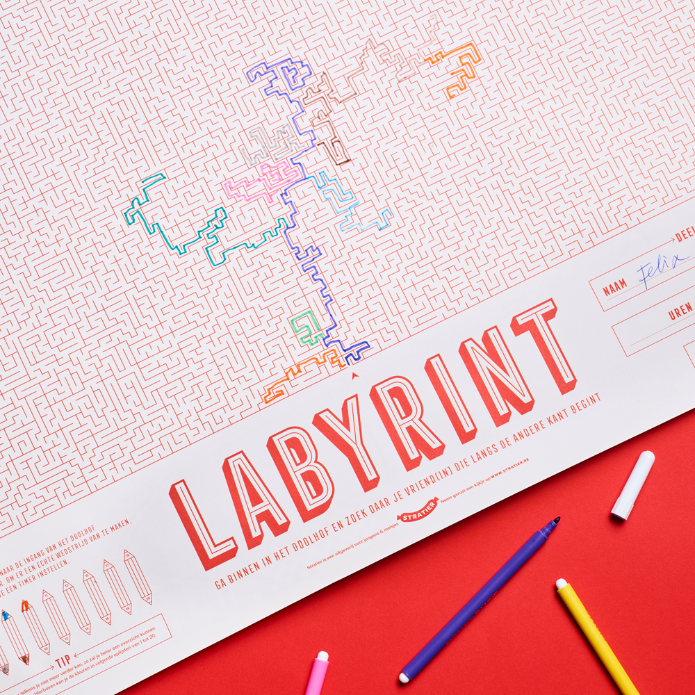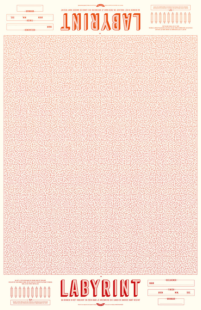 Ga binnen in het mega-doolhof van 65 x 100 cm en zoek daar je vriend(in) die langs de andere kant begint. Er is maar één route mogelijk... dus uiteindelijk kom je elkaar tegen... maar waar? Fijne zoektocht!